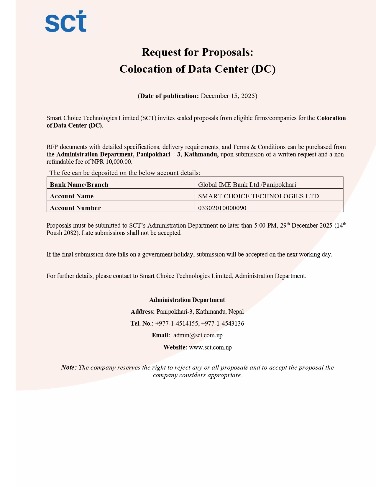 Request for Proposal: Implementation of Comprehensive Tokenization Solution for Payment Services to SmartChoice Technologies Ltd.